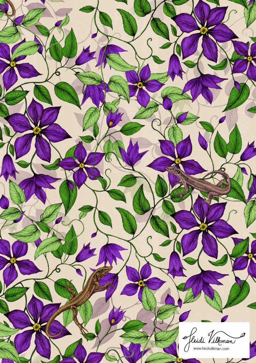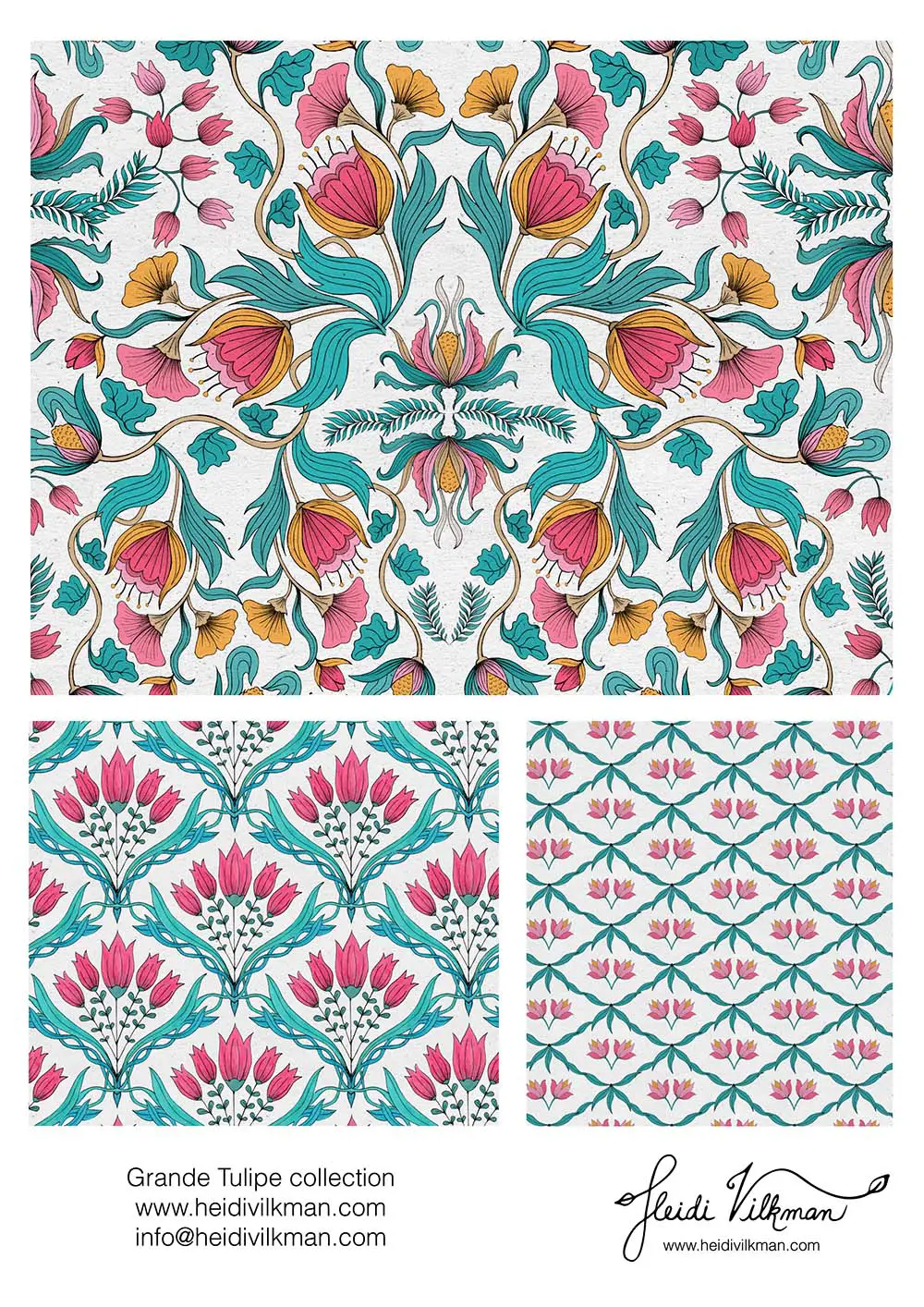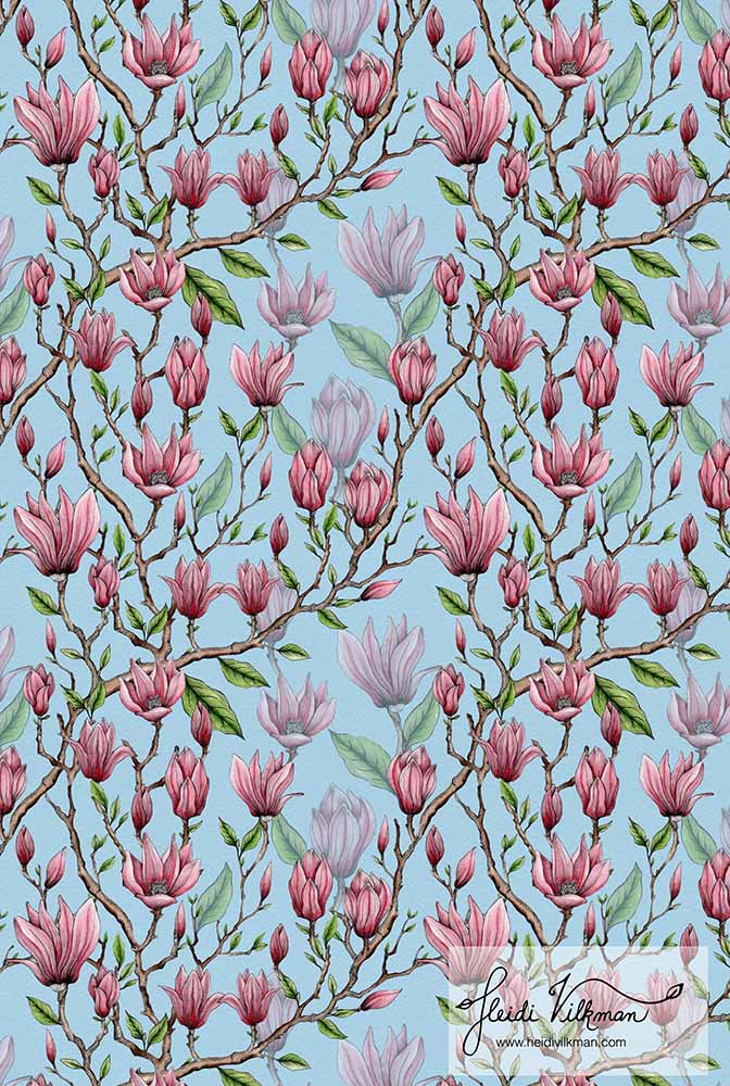 My great passion: Florals and Botanicals. All hand drawn or painted, compiled into patterns in either Illustrator or Photoshop. Other colour ways available on request.